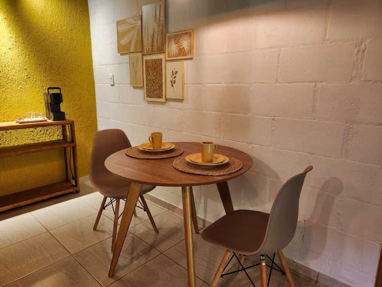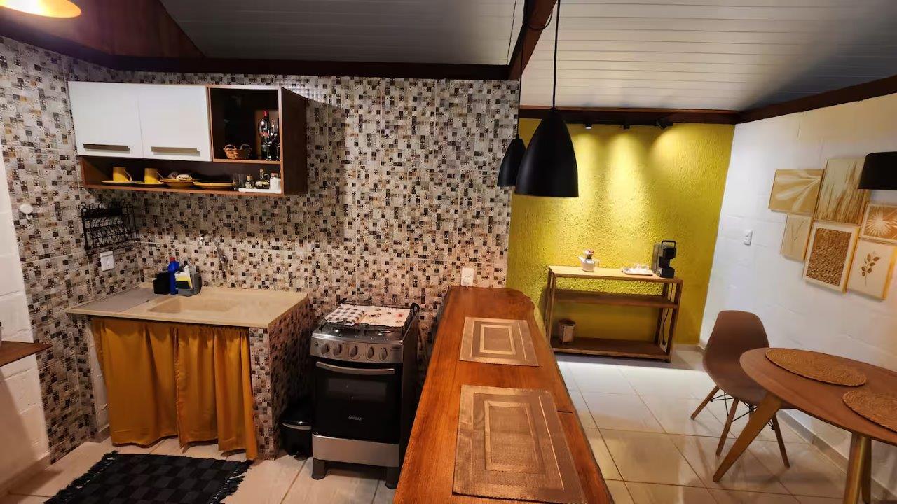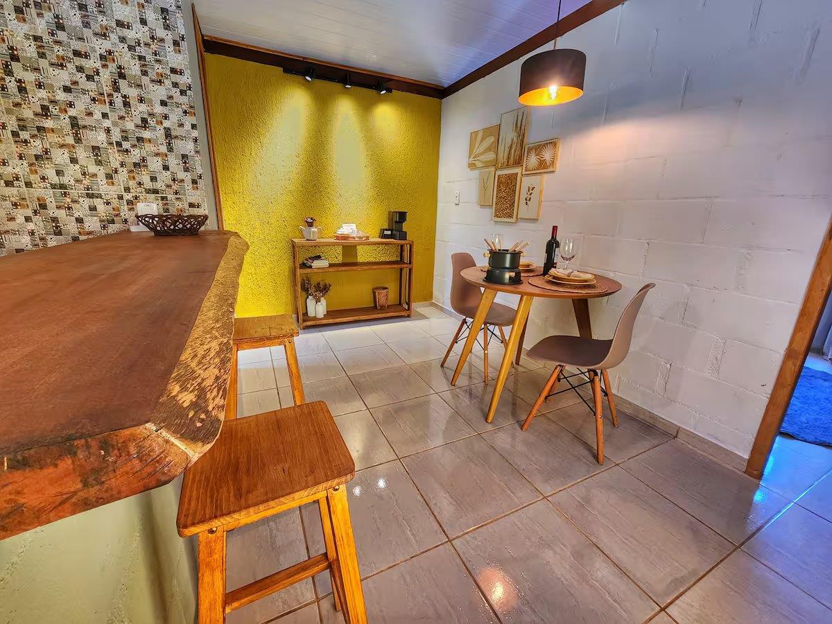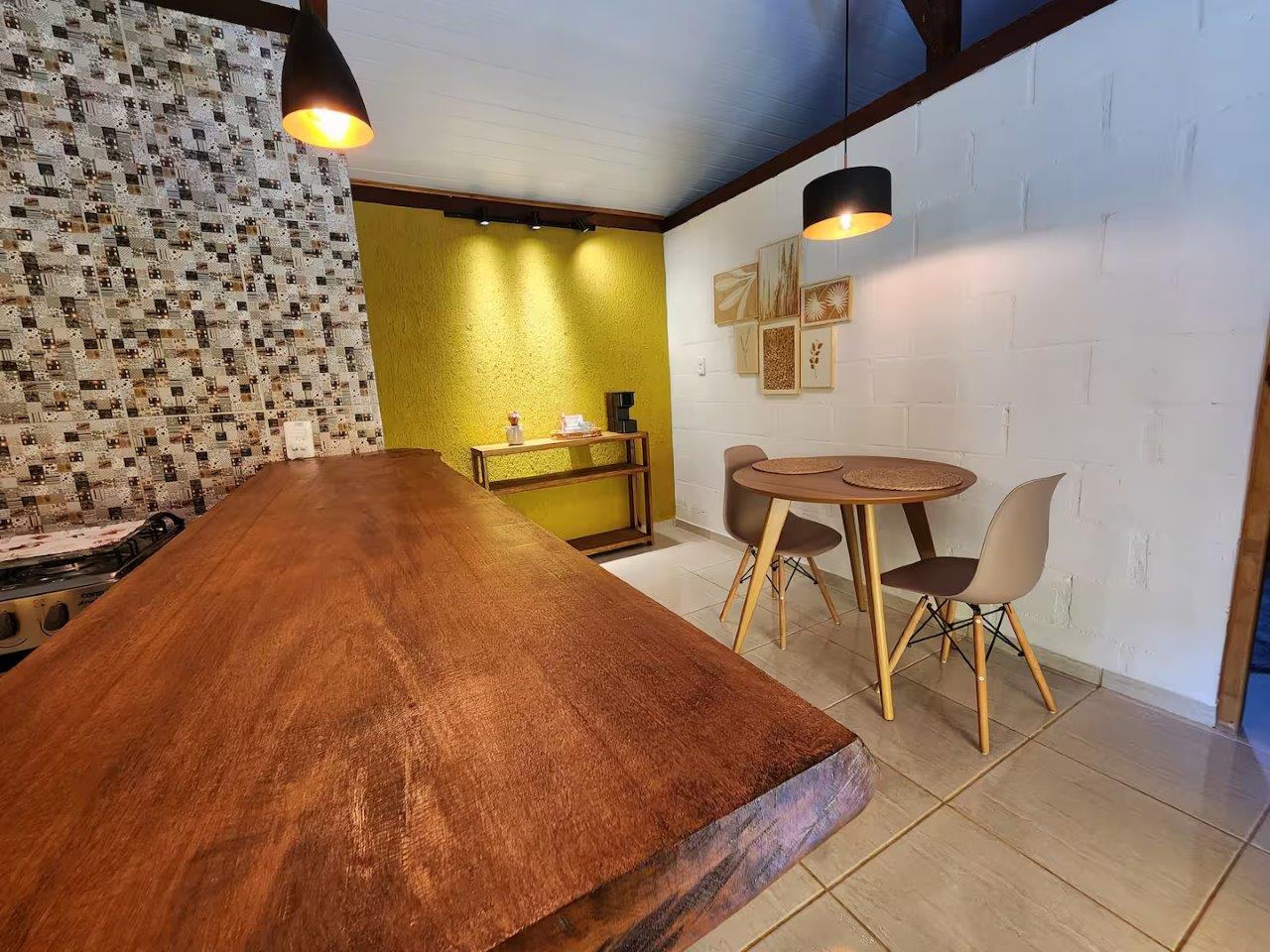 Esse é o terceiro chalé da Vila, especial para casais, com uma sala de jantar e um cantinho do café com a máquina de café expresso 3 Corações. 🧡